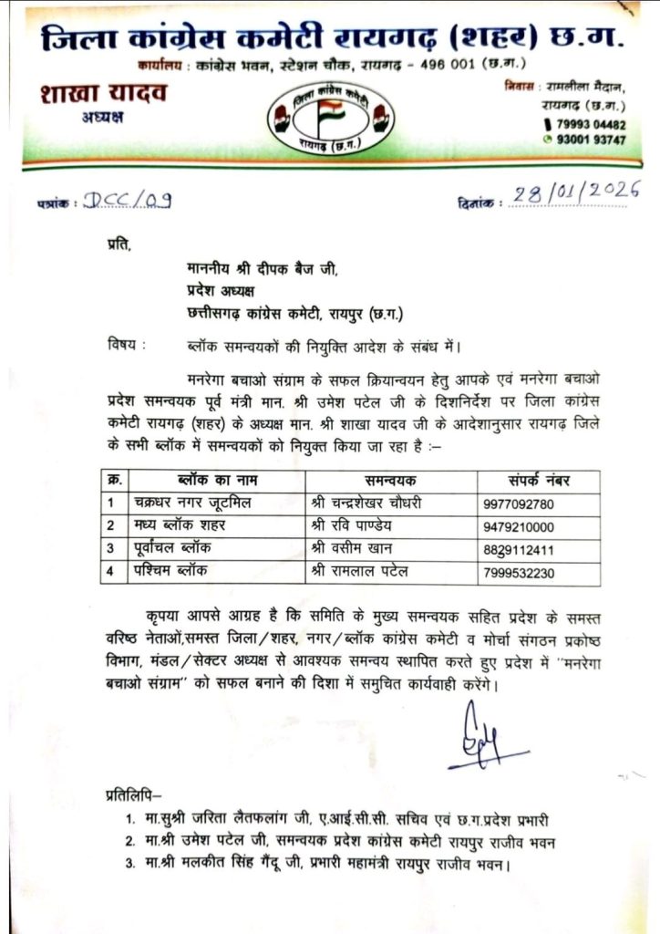 रायगढ़ 29जनवरी मनरेगा बचाओ संग्राम के सफल क्रियान्वयन हेतु प्रदेश कांग्रेस अध्यक्ष दीपक बैज एवं मनरेगा बचाओ प्रदेश समन्वयक पूर्व मंत्री मान. उमेश पटेल जी के दिशनिर्देश पर जिला कांग्रेस…